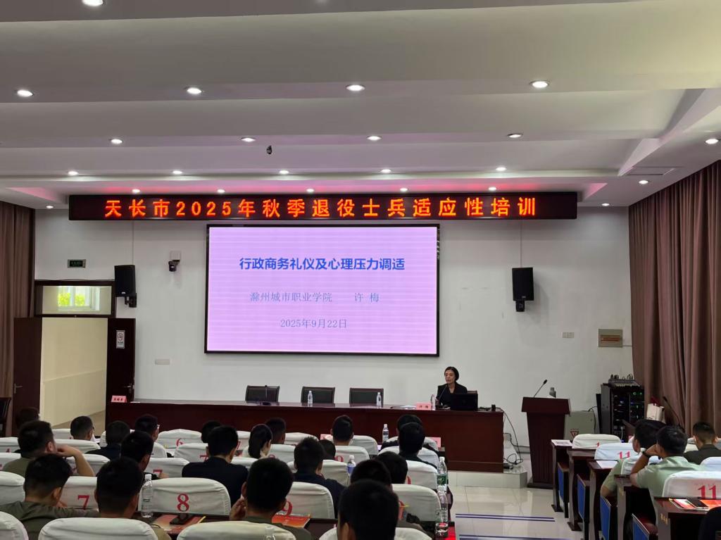 近日,我校公共教学部教师、继续教育学院院长许梅受邀前往天长市,为当地近200位秋季退役士兵开展以“行政商务礼仪及心理压力调适”为主题的适应性培训。培训过程中,许梅凭借扎实的专业功底与丰富的实践经验,为退役士兵破解职场转型难题,不仅展现了我校教师服务社会的责任担当,更搭建起校地协同助力退役军人发展的桥梁。