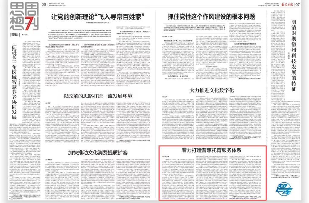 9月30日,《安徽日报》刊发我院院长徐立娟理论文章《着力打造普惠托育服务体系》。