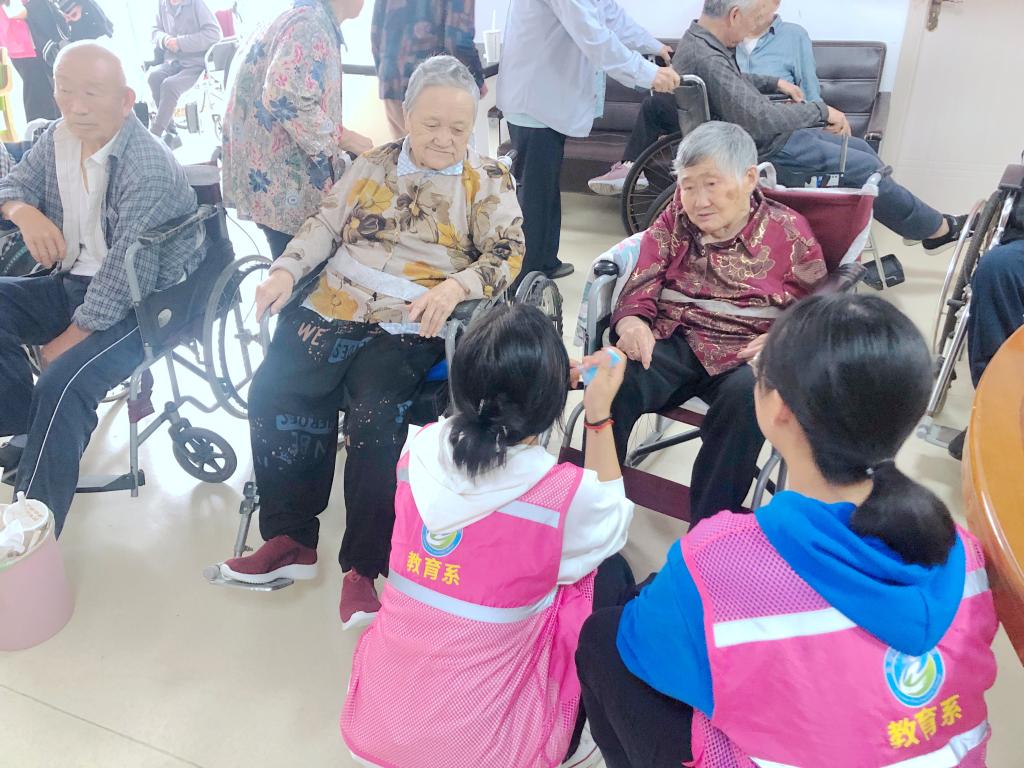 志愿者们与老人亲切交谈,详细了解老人身体、生活、饮食等情况,通过拉家常的方式,志愿者逐渐拉进了与老人们的距离,老人也渐渐敞开了心扉,与志愿者们攀谈了起来。此外,志愿者们还给老人放松身体、给老人讲故事、唱歌、小游戏等,现场充满了欢声笑语。一个个小小的身躯,奉献着大大的志愿力量,为老人们送去祝福送去温暖。