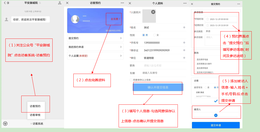 2.申请填报:校外人员可按以下流程提交申请(流程为:在手机微信客户端页面中搜索“平安滁城院”公众号并关注,在打开的公众号页面中依次选择“访客系统”→“访客预约”→“提交预约”),按要求填写完整信息。操作流程见下图