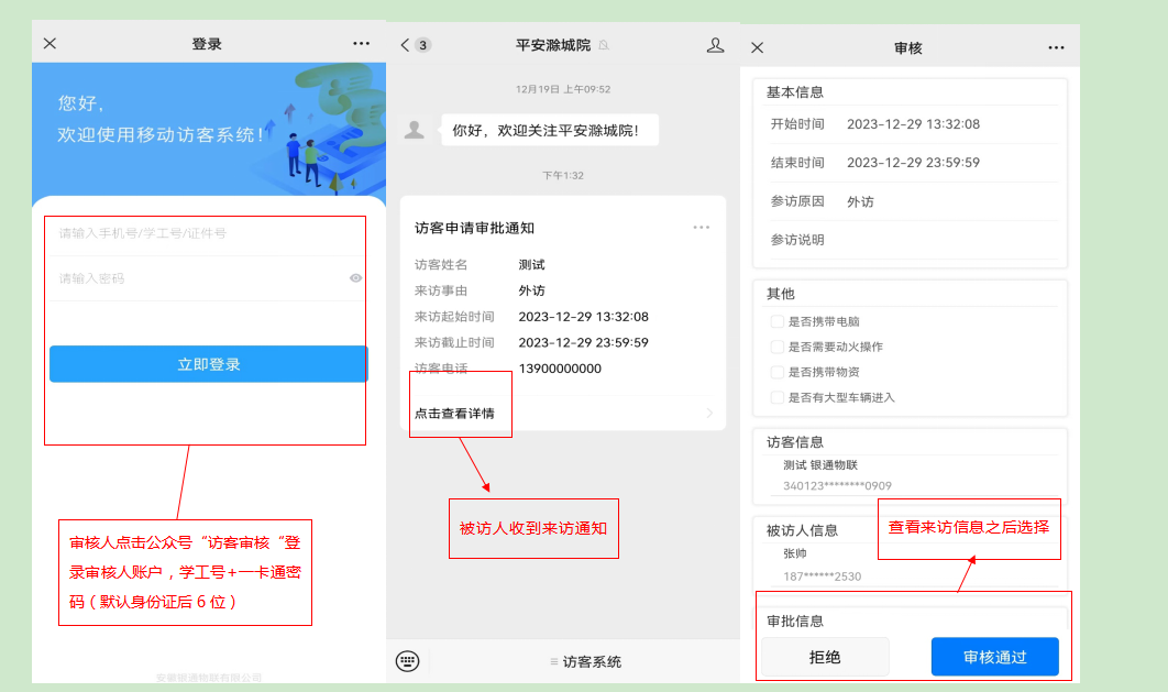 3.入校审批:校外人员提交申请后,由校内联系人审核并提交本单位领导进行审批(流程为:关注“平安滁城院”公众号→“访客系统”→“访客审核”)。操作流程详见下图。