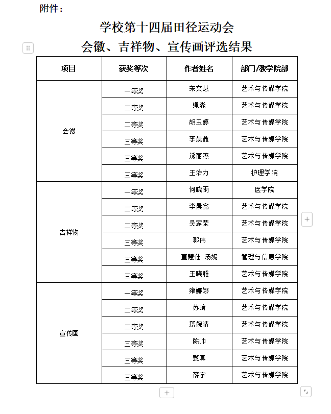 关于公布学校第十四届田径运动会会徽、吉祥物、宣传画评选结果的通知