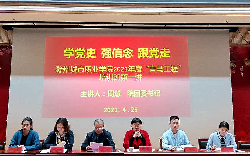为进一步引领青年学生骨干深入学习贯彻习近平新时代中国特色社会主义思想和党的十九大精神,加强当代青年大学生“学党史、强信念、跟党走”党史学习教育,培养一批德智体美劳全面发展的社会主义建设者和接班人。4月25日下午,学院在四楼报告厅举办“学党史、强信念、跟党走”学习教育暨2021年“青马工程”培训班开班仪式。党委委员、副院长施向阳为开班仪式致辞并授旗,团委书记、定远县池河镇党委副书记周慧,各系团总支书记,2021年“青马工程”全体学员及全院团支部书记,仪式由团委副书记陈婷婷主持。